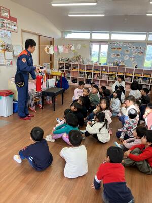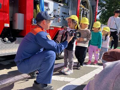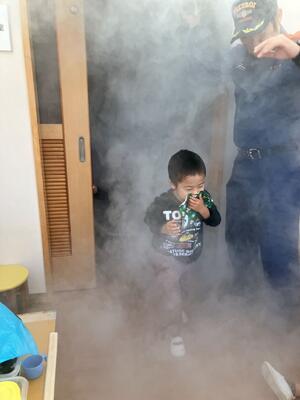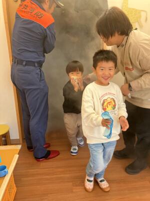 少々怖がる子も見られましたが、「『煙は怖い』が、良く理解できているね!」と消防士さんから褒められると、教師や友達と一緒に、勇気を出して参加できました。
